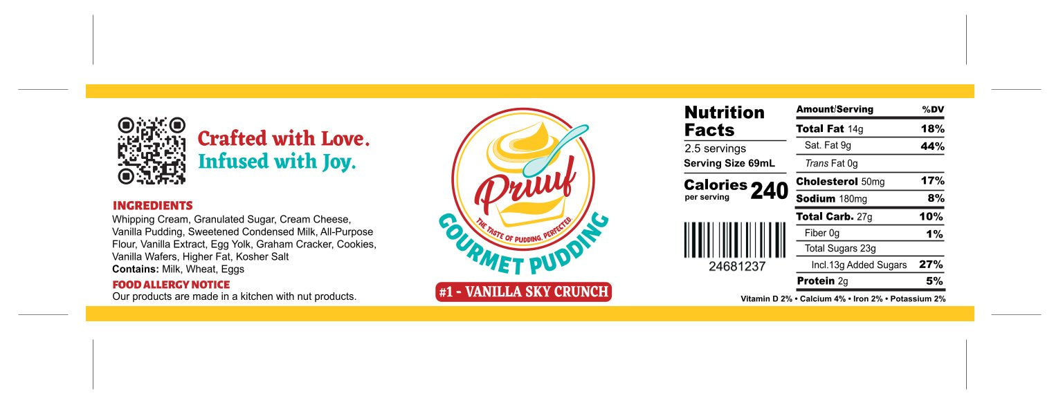 Pruuf#1 takes you on a nostalgic journey, layering rich, creamy vanilla bean pudding with the comforting warmth of crumbled graham crackers and the delicate sweetness of vanilla wafers. Each spoonful is a harmonious balance of velvety smoothness and satisfying crunch, delivering a familiar yet elevated taste experience.